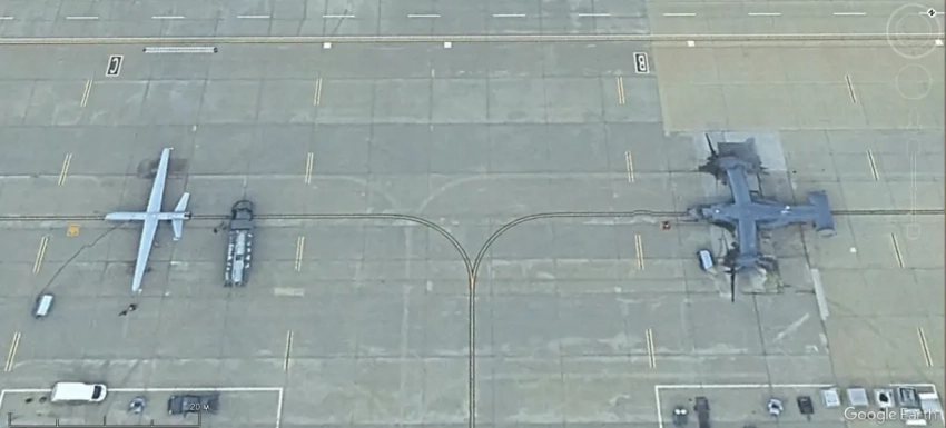 Спутниковый снимок Google Earth: БПЛА рядом с конвертопланом CV-22B Osprey на авиабазе Кэннон
