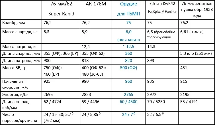С лёгкой подачи политолога Соловьёва В.Р. стал популярен тезис о том, что надо воевать современным оружием, а не легендарным. Корабельные артиллерийские установки из таблицы вполне себе современны и востребованы флотами разных стран, в будущем могут получить и статус легендарных. А вот советская зенитная пушка и немецкий танк давно уже стали легендарными. В таблицу же они объединены как образцы вооружения калибра 75-76 миллиметров с выдающимися характеристиками для своего времени. И наша попытка создания орудия для ТБМП должна впитать всё лучшее из мирового опыта.