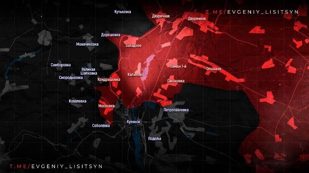 С Купянского участка сообщают о продвижении в районе Радьковки. ВС РФ обогнули Соболевку с севера и вышли к дороге на Чугуев, фактически взяв её под контроль. В Купянске идут бои, есть продвижение в северо-западной части города.