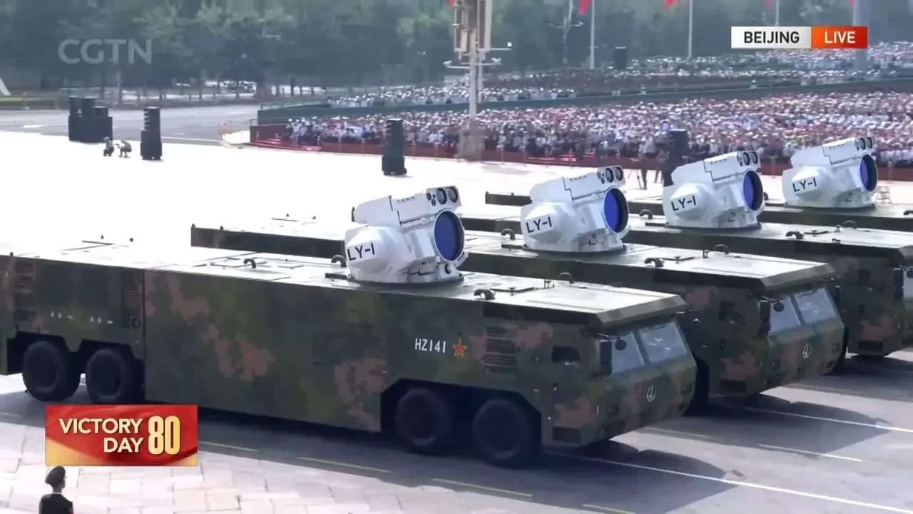В колонне вооружений для ВМС впервые показали лазерные комплексы LY-1. Это боевые модули со специальным оснащением, предназначенные для установки на кораблях. В рамках парада их показали при помощи многоосных шасси. По всей видимости, эти изделия предназначаются для борьбы с БПЛА или высокоточным оружием в ближней зоне или на малой дальности.