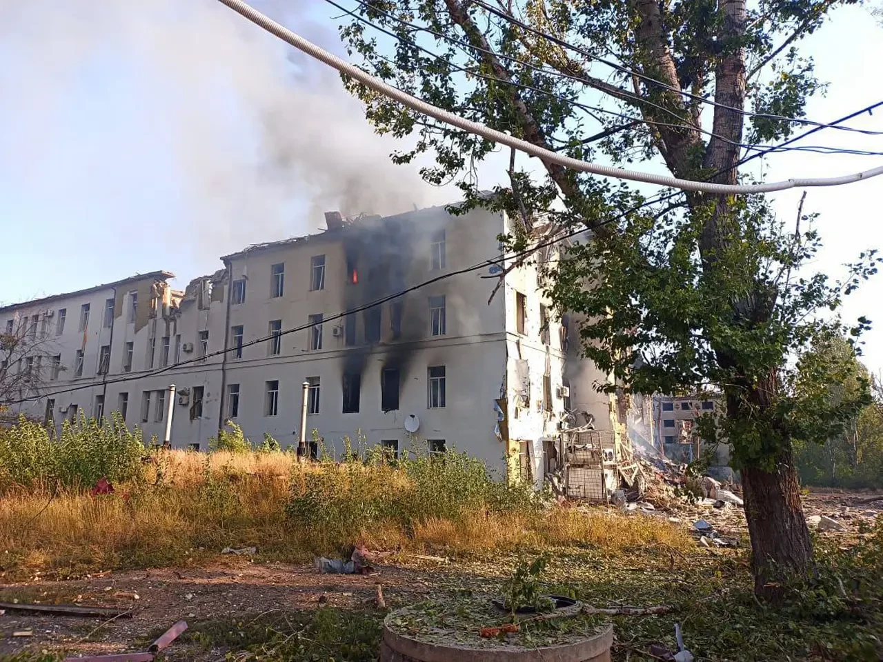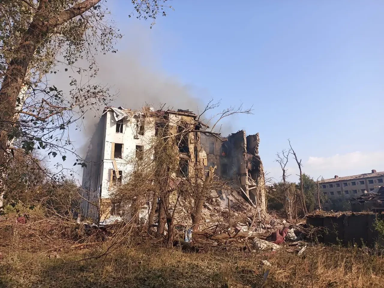 Однако украинский фотограф изрядно прокололся с ракурсом. Если изначально всё шло «по плану» - горящее здание со значительными повреждениями от ударов, то потом фотограф явно расслабился.