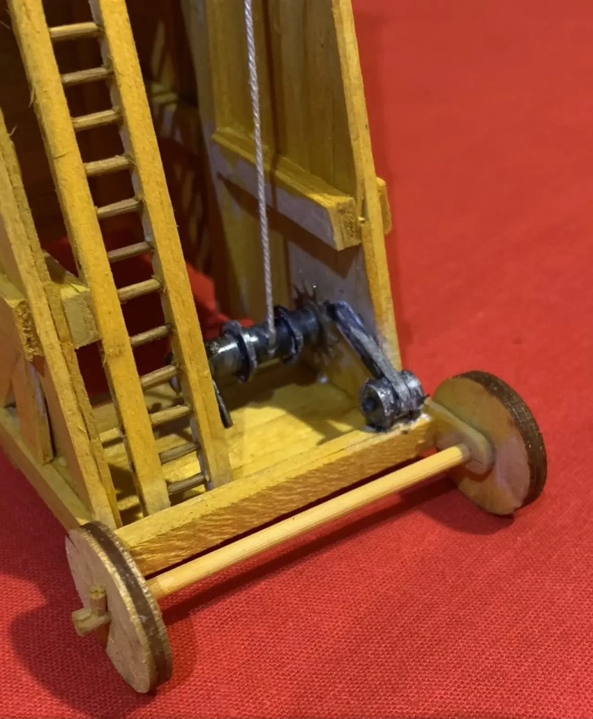 Штурмовую аппарель, по которой воины перебегали на стену города, лучше всего сделать откидывающейся, то есть у нас в итоге должен будет получиться не статичный макет, а действующая модель осадной башни. Поднималась же эта аппарель и опускалась при помощи обыкновенного ворота с храповым механизмом. Вал ворота проще всего сделать из толстой вязальной спицы, просверлив на торцах отверстия для осей из зубочисток, а в самом валу ворота – два сквозных отверстия для рукояток, за которые его и вращали. Храповик можно взять из деталей старых часов, например будильника, или аккуратно вырезать из ламеля, что, конечно, довольно сложно, но зато и очень интересно. Блокиратор храповика – обычная пластинка из дерева или пластмассы, закрепленная на вращающейся оси. Готовый ворот следует окрасить под цвет металла – железа или бронзы.
