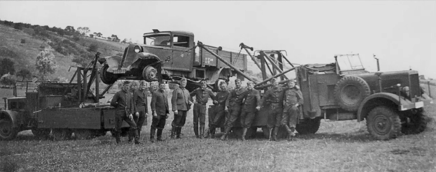 Восстановление собственной брошенной или повреждённой техники. На фото эвакуируют средний тягач грузоподъёмностью 5 тонн mittlerer Zugkraftwagen 5t (Sd.Kfz. 6) ранней модификации