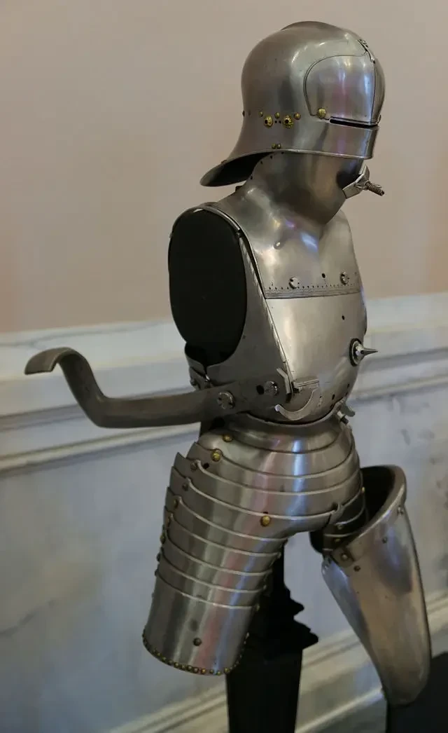 Ну а такие доспехи с дополнительным бронированием левой руки и части корпуса вместе со шлемом в XVI в. использовались уже только на турнирах. Оружейная палата дворца Новый Хофбург, Вена. Фотография автора