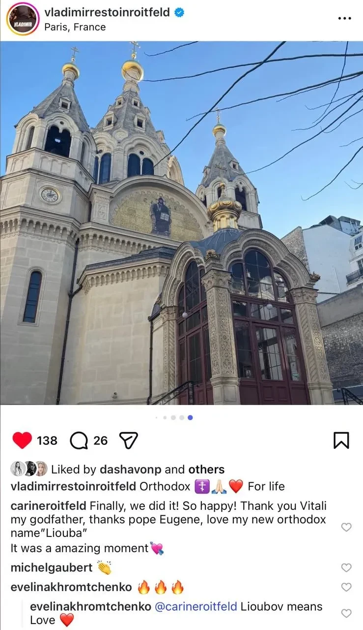 Фото Карин Ройтфельдhttps://t.me/spletnik2006/47709Известно, что обряд состоялся в соборе Александра Невского в столице Франции — историческом центре местной русской православной общины. Крёстным 41-летнего Владимира стал его друг детства Александр Песко, а у Карин — продюсер Алексей Киселёв. На крещении также присутствовала её дочь, 45-летняя модель и дизайнер Джулия.