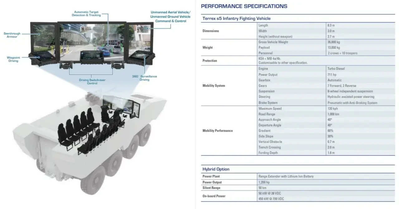 Terrex S5 имеет цифровую «нервную систему» на основе шины данных стандарта NATO (NGVA), позволяющей управлять как бортовыми, так и внешними средствами, например, дронами. Большой вес платформы (до 35 тонн) позволяет размещать на ней разнообразное вооружение, оборудование и броню, не приводя к потере мобильности.