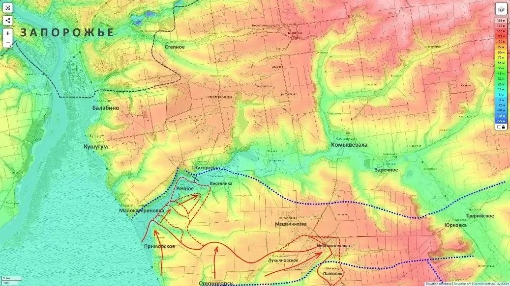 Не менее драматичные события для украинской стороны разворачиваются на Запорожском фронте. Подтверждена информация об освобождении населенного пункта Речное. Взятие этого села знаменует коренной перелом на левом фланге данного участка: российские войска успешно продвигаются вдоль долины реки Конка.