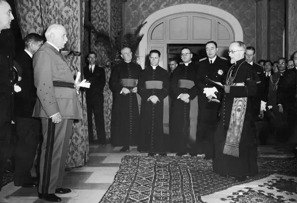 На фото слева: визит испанского короля Альфонсо XIII и королевы Виктории Евгении Испанской в Папское государство. Имея официальный титул Rex Catholicissimus («Их Католические Величества») и будучи набожными католиками, они поддерживали тесные связи с Церковью и имели аудиенции у пап в Риме. На фото справа: премьер-министр Португалии и апостольский нунций кардинал Пьетро Сириачи во время ратификации конкордата 1 июня 1940 года, закрепившего тесные отношения между авторитарным режимом А. Салазара и Католической церковью, предоставив ей значительное влияние в обмен на поддержку Церковью стабильности государства. Источник: Vatican News