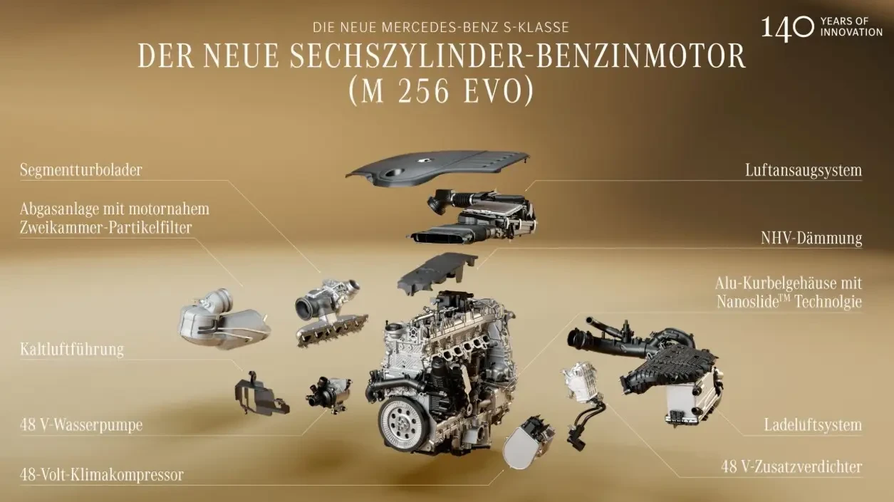 Рядные шестицилиндровые бензиновые моторы S 450 и S 500 (M256 Evo) получили более мощный электрический бустер-турбонагнетатель (система eBooster/48 V mild hybrid), который в нижнем диапазоне оборотов помогает турбине и практически полностью устраняет турбояму, особенно при обгонах или спонтанном ускорении.