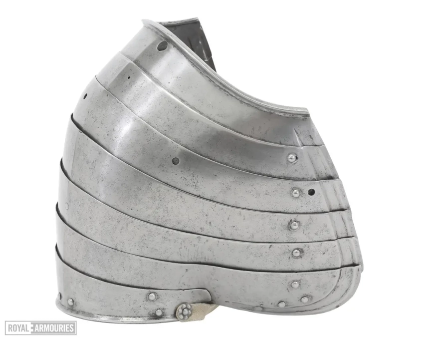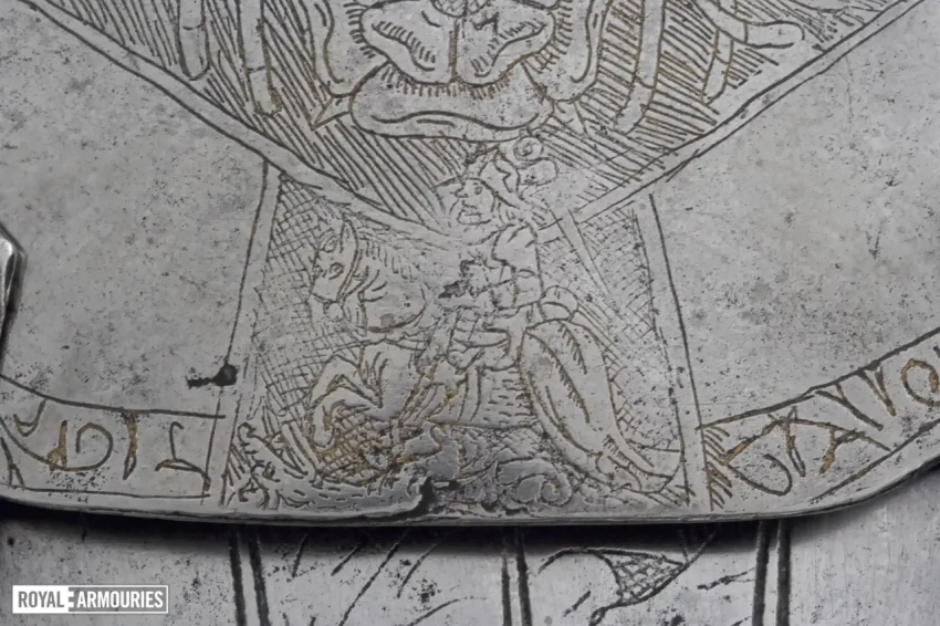 Наплечники из перекрывающих друг друга пластин стали отличительной особенностью мастерской в Гринвиче. Левый (если смотреть спереди) наплечник состоял из восьми полос, а вот правый почему-то из семи. Юбка состоит из девяти полос, как спереди, так и сзади. Петли на ней находятся слева, пряжки ремней справа. Латы для ног могли быть изготовлены в Италии или во Фландрии. Их попросту взяли от какого-то старого доспеха.
