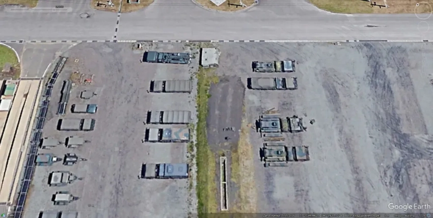 Спутниковый снимок Google Earth: военная техника советского производства на базе хранения во Флориде. Хорошо различима СПУ 2П24 с двумя ЗУР 3М8 и СНР 1С32 из состава ЗРК «Круг». Снимок сделан в марте 2013 года