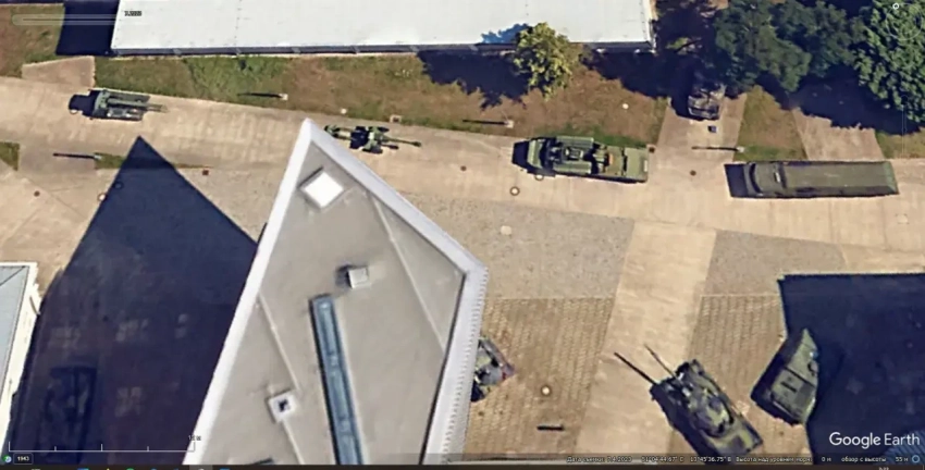 Спутниковый снимок Google Earth: ЗРК «Оса» среди других экспонатов военного музея в Дрездене. Снимок сделан в июле 2023 года