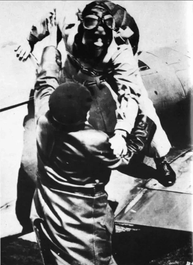 Ганс Дитерле (Hans Dieterle) вылезает из кабины после рекордного полёта. Его встречает ответственный за спецполёты, ассистент Хейнкеля Лупп Кёлер (Lupp Köhler)