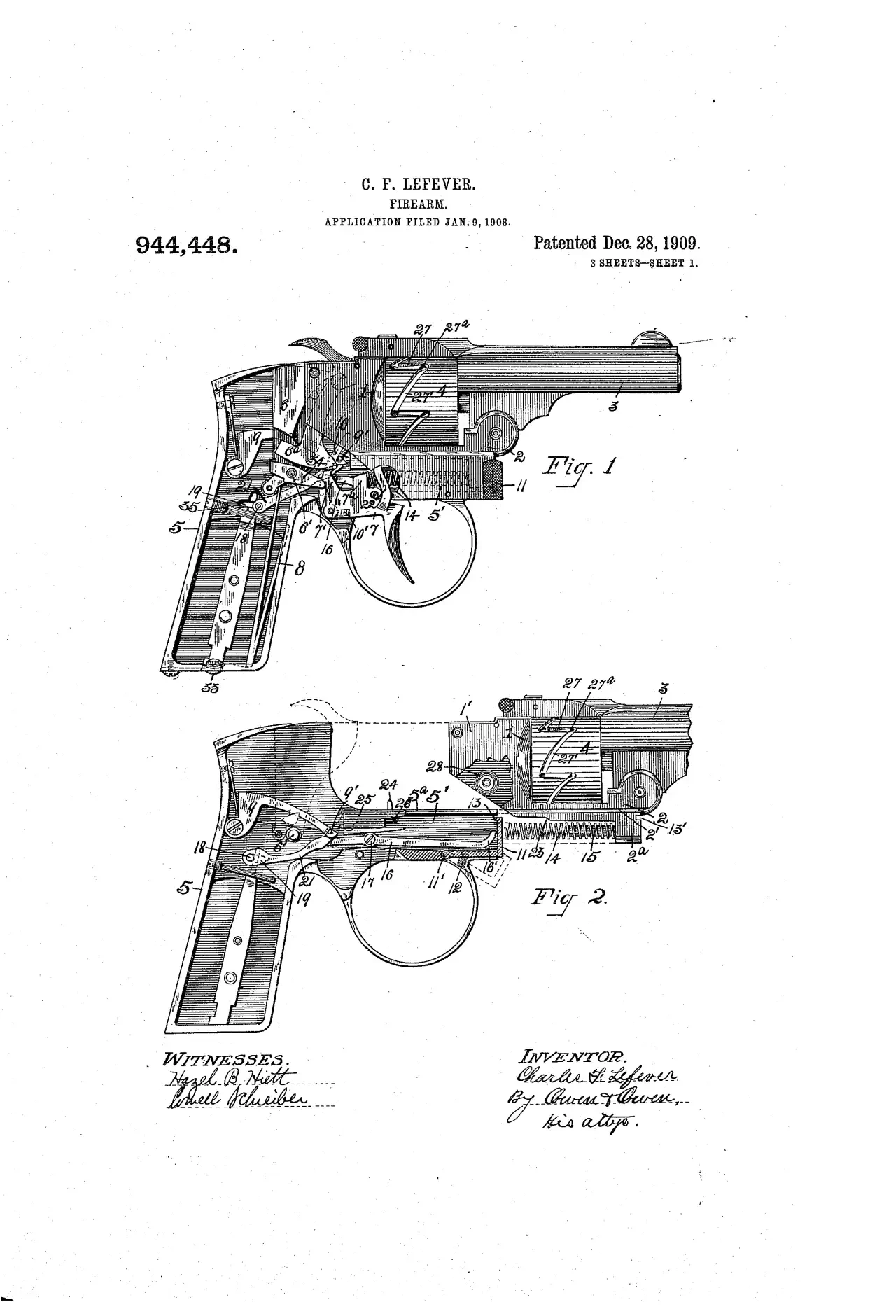 Чертежи автоматического револьвера Чарльза Лефевера из патентной документации 1909 г.