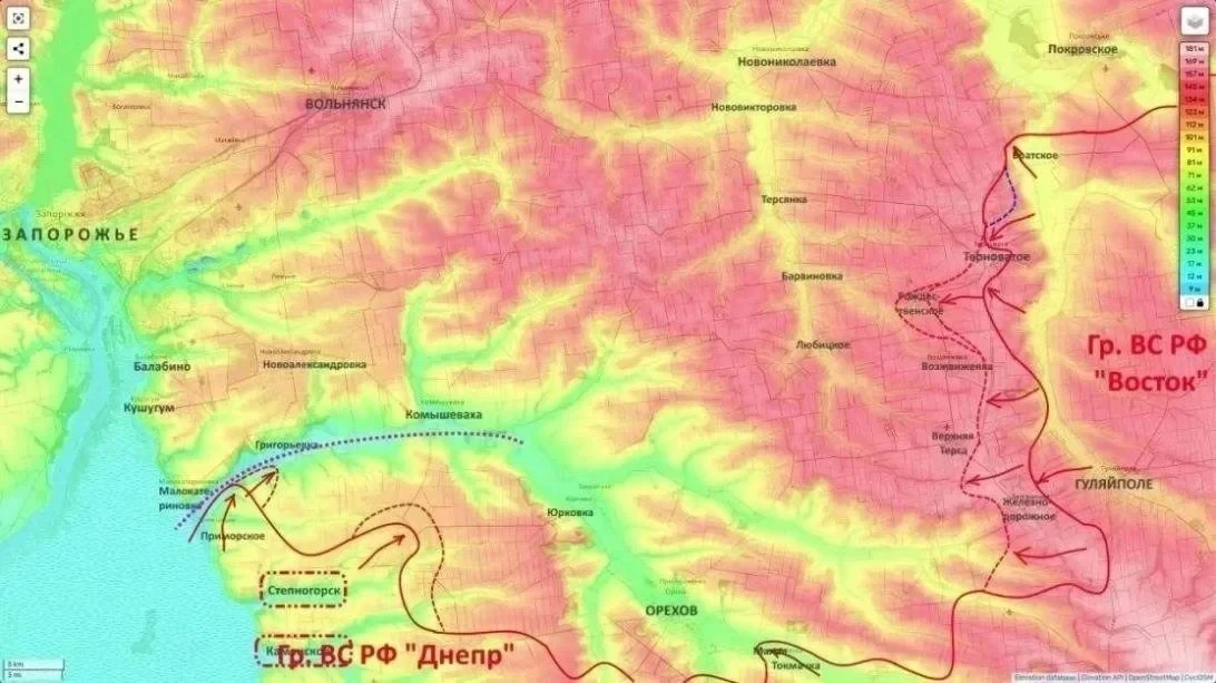 Это продвижение отбрасывает украинские формирования от Гуляйполя, которое обещал «вернуть под контроль» главком ВСУ Сырский. Соответственно, противнику приходится пятиться в упомянутом селе Гуляйпольском и к западу от него, а там порядка 20 км до Орехова и порядка 11 км до одного из маршрутов снабжения украинского гарнизона в Орехове. Этот маршрут противник называет восточным. Идёт он со стороны Новониколаевки, что к северу от города.