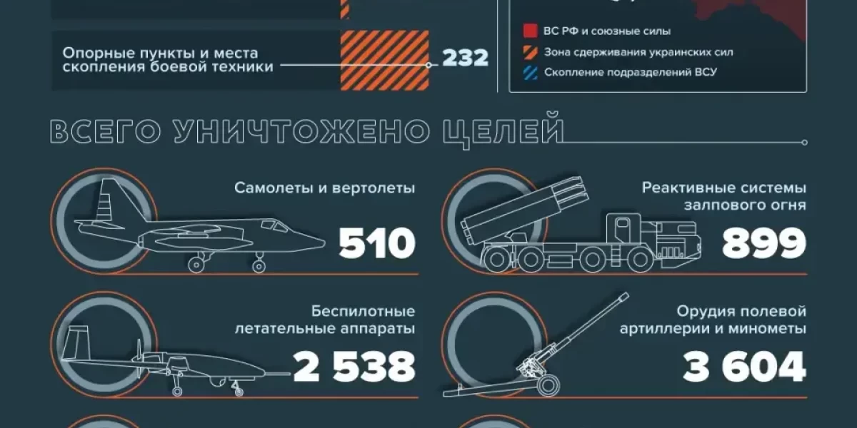 ? Всего с начала проведения специальной военной операции уничтожены: 333 самолета, 177 вертолетов, 2538 беспилотных летательных аппаратов, 388 зенитных ракетных комплексов, 6729 танков и других боевых бронированных машин, 899 боевых машин реактивных систем залпового огня, 3604 орудия полевой артиллерии и миномета, а также 7293 единицы специальной военной автомобильной техники.