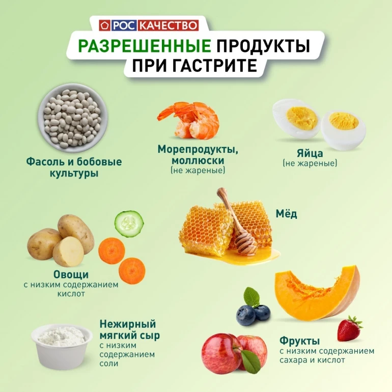 Многие знают, что жирная, острая, жареная еда раздражает желудок и повышает кислотность. Но сводить рацион к жидкой каше на воде, конечно, тоже не стоит. Так, вы точно можете позволить себе почти все фрукты и овощи, бобовые, яйца, морепродукты, мёд и нежирный сыр.