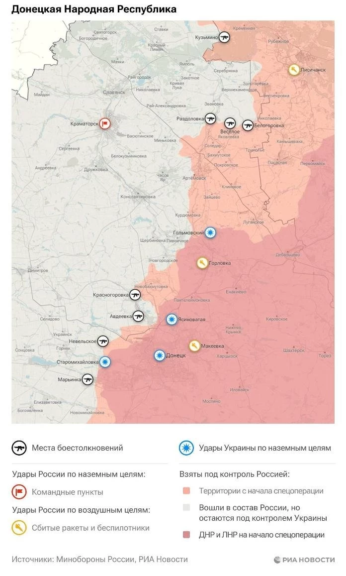 «Около 150 единиц погибшего личного состава, десятки единиц военной боевой техники — это и иностранные образцы в том числе», — сказал Гагин РИА Новости.