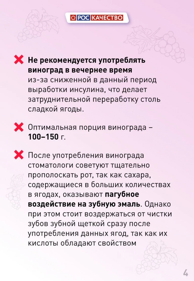 Виноград — это кладезь витаминов группы В, K, А, С, Е, калия, кальция, железа, магния и меди. Ещё ягоды содержат клетчатку, органическую кислоту и сахар. Но полезно это лакомство не всем, а некоторым и вовсе противопоказано. В каких случаях виноград может навредить, почему его не стоит употреблять на ночь, можно ли его есть с косточками, и о других тонкостях его употребления рассказали в Роскачестве.
