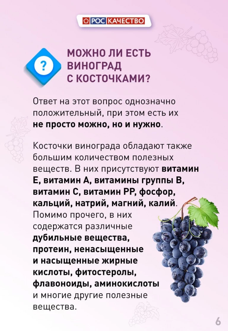 И, наверное, главное, что волнует любителей винограда: можно ли его есть с косточками? Эксперты однозначно отвечают, что не только можно, но и нужно. Ведь именно в них прячется основная масса полезных веществ.
