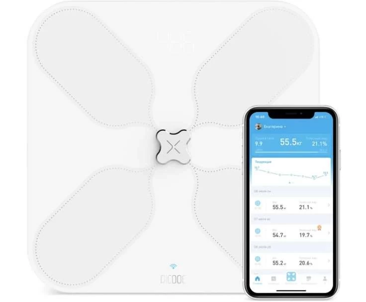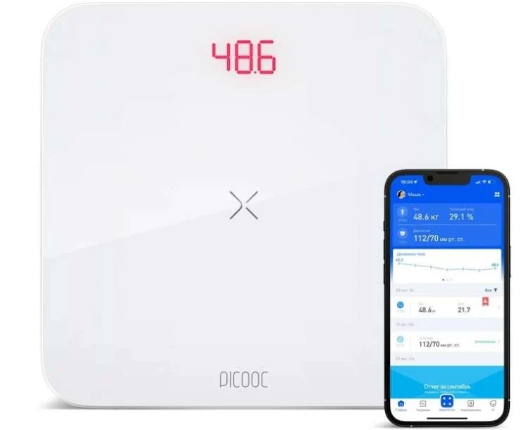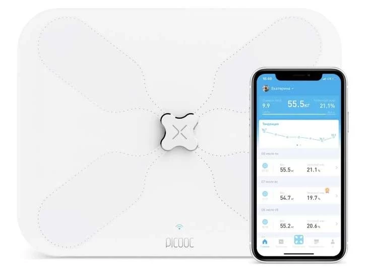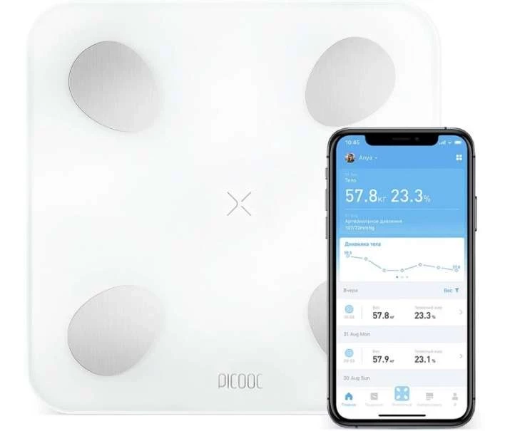- Продвинутые Bluetooth-весы Picooc. Используют метод многофазного биоимпеданса, повышающий точность измерений. Соединяются со смартфоном при помощи Bluetooth и определяют 18 параметров тела;