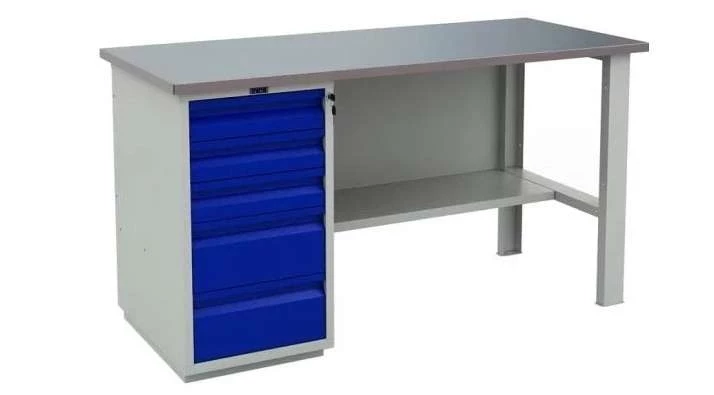 Верстак Практик Profi (№604) WT160. WD5/WD5.000 ярко-синего цвета для слесарных работ с двумя тумбами, а также имеет много ящиков выдвижной конструкции. Для надежности инструментария Практик предусмотрел центральный замок. Под столешницей располагается дополнительная полка, куда можно складывать личные вещи, инструменты, изделия и материалы. Тумбы устанавливают с любой стороны, как это будет удобно владельцу.