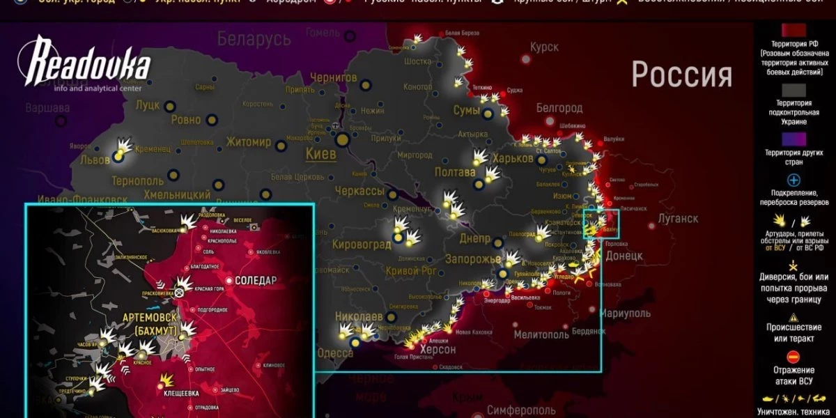 К юго-западу от Бахмута украинская армия вновь контратаковала в районе Ивановского и несколько отодвинула ЧВК «Вагнер» от трассы на Константиновку. По Клещеевке и Курдюмовке била артиллерия ВСУ. «Оркестранты» предприняли попытку прорыва к Дылеевке. Обстреляли Предтечино, Ступочки и Часов Яр. К северу от Бахмута «Вагнер» продолжает атаковать гарнизон ВСУ, который не желает оставлять Парасковьевку. К северу от Соледара ЧВК «Вагнер» после обстрела вела штурмовые действия в направлении Фёдоровки. ВСУ удержали позиции. Российская артиллерия бьёт по соседним Васюковке и Роздоловке. А северо-восточнее вела огонь по Выемке, Спорному и Новосёловке.