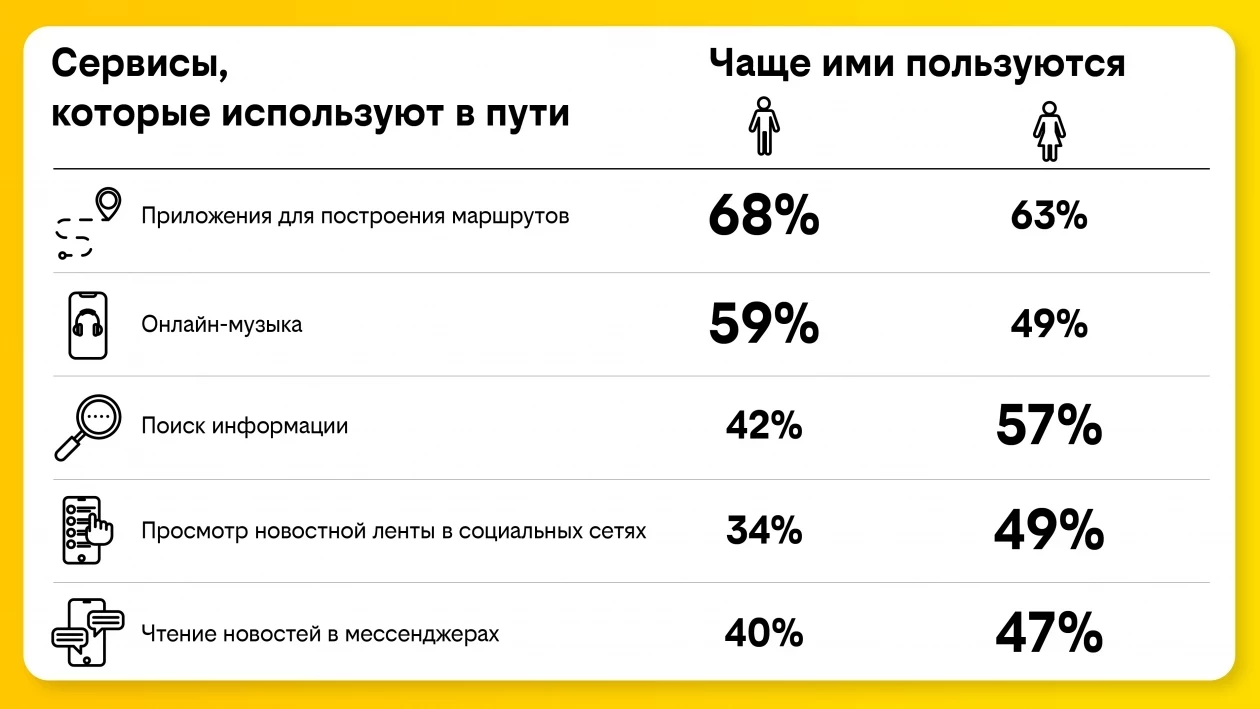 Интересно, что у респондентов разного пола и возраста наблюдаются достаточно заметные различия в использовании онлайн-сервисов в транспорте. Так, женщины в пути значительно чаще, чем мужчины, просматривают новостную ленту в социальных сетях (49% и 34% соответственно) и публикуют там же фотографии и видео (37% и 26%). Мужчины в дороге чаще отдают предпочтение музыкальным онлайн-сервисам (59% против 49%).