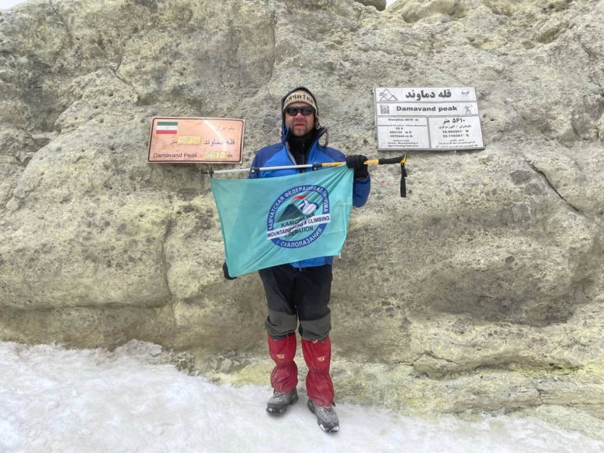 Флаг Камчатской федерации альпинизма и скалолазания — на вершине Демавенда!. Фото: Максим Красков