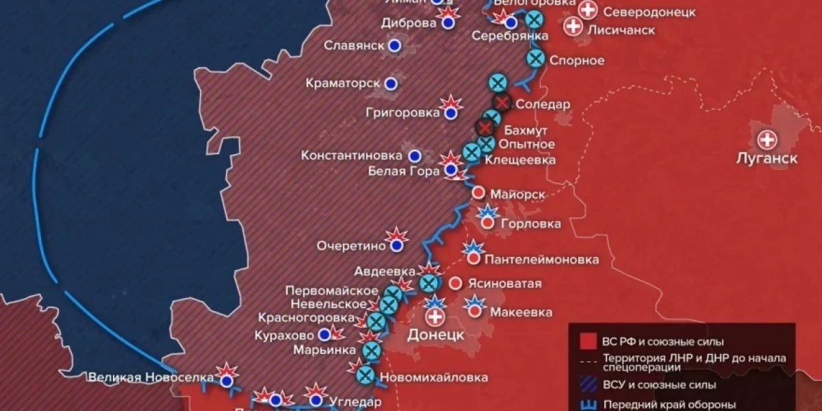 Как сообщается, в разгар ожесточенных боев штурмовики ЧВК «Вагнер» и российские десантники продвинулись в центр Соледара и его окраины, а также сумели взять Бахмутское, разрезав город по кругу. Несмотря на ожесточенное сопротивление, украинские войска были вынуждены отступить на север, фактически сдав весь центр нашим силам. Карта