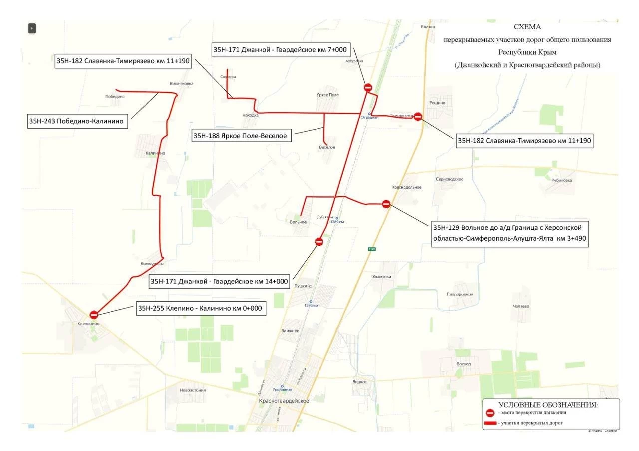Министерство транспорта Крыма опубликовало схему временного перекрытия дорог в Джанкойском и Красногвардейском районах.
