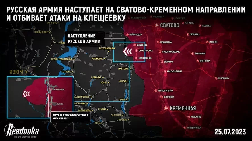 На Сватово-Кременном направлении российская армия после успешного форсирования реки Жеребец и штурма укрепрайона противника в районе Кармазиновки активно давит Вооруженные силы Украины (ВСУ). Сейчас общее продвижение наших бойцов составляет до 4 км.