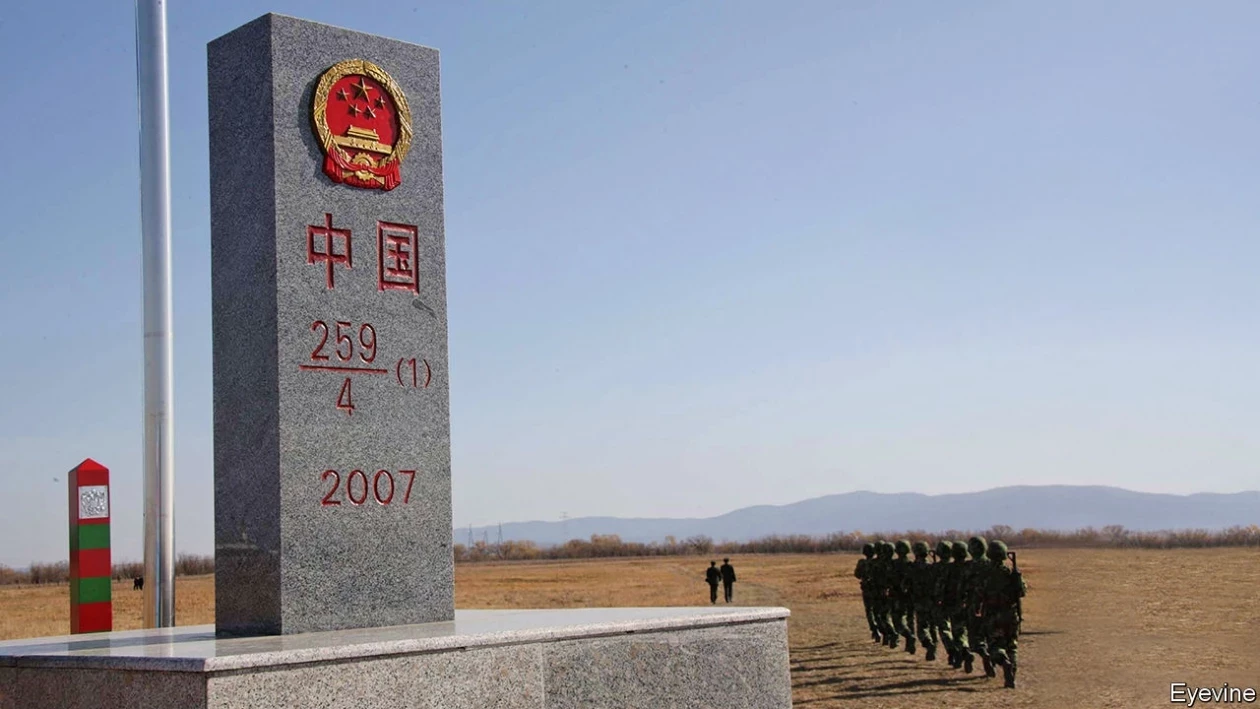 Современные пограничные столбы на российско-китайской границе: на переднем плане — китайский пограничный столб, на заднем плане — российский.. Фото: из открытых источников