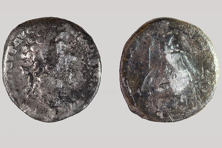 В итоге монета была идентифицирована серебряный динарий времен правления императора Марка Аврелия (годы правления 161–160 гг. н.э.). Денарий довольно сильно изношен и весит 2,4 грамма, что свидетельствует о том, что он был отчеканен во время обесценивания валюты, когда содержание серебра резко упало из-за роста инфляции.