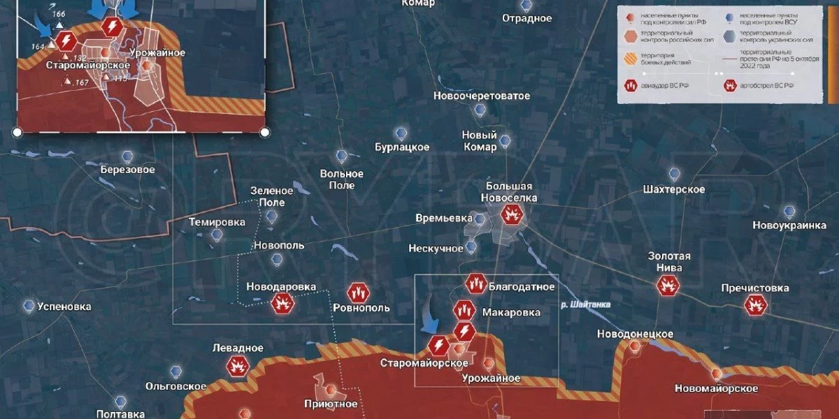Основные усилия ВСУ сосредоточили на позициях ВС РФ на возвышенности к западу от села. Само Старомайорское расположено в низине и без контроля над прилегающими высотами наступление будет осложнено.