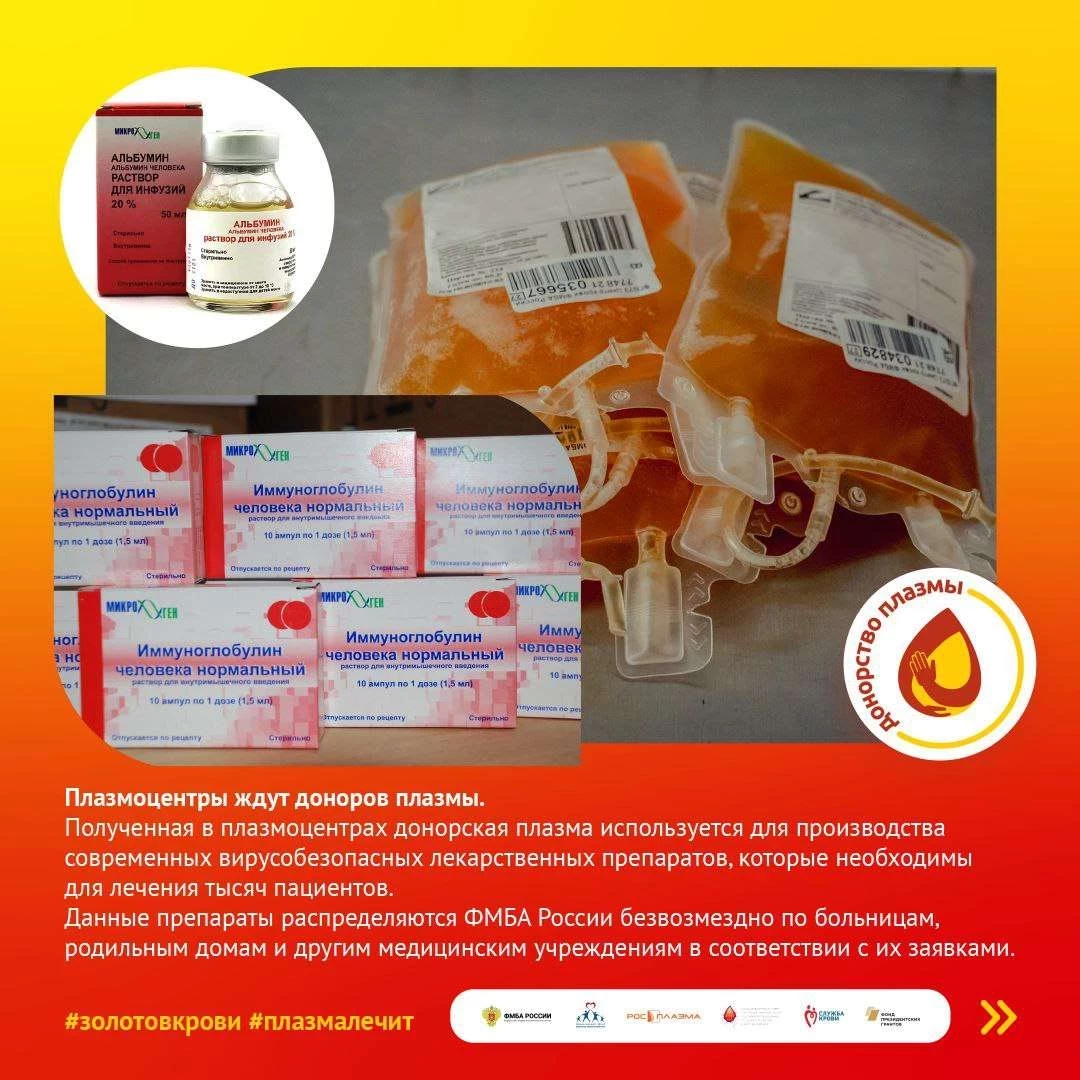 В России ежегодно более 1 миллиона человек нуждается в препаратах альбумина и иммуноглобулина. Именно плазма доноров необходима для изготовления лекарственных препаратов на основе специфических иммуноглобулинов, в том числе противостолбнячных, антистафилококковых, против гепатита В и клещевого энцефалита».