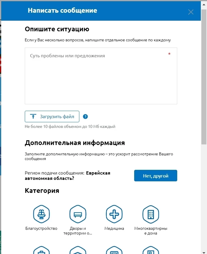 Для сообщения о возникшей проблеме в онлайн-режиме гражданину достаточно авторизоваться на портале “Госуслуги” и войти в личный кабинет. После этого необходимо заполнить электронную форму сообщения, описав ситуацию: кратко сформулировать суть вопроса, указать дополнительную информацию, которая может ускорить срок рассмотрения.