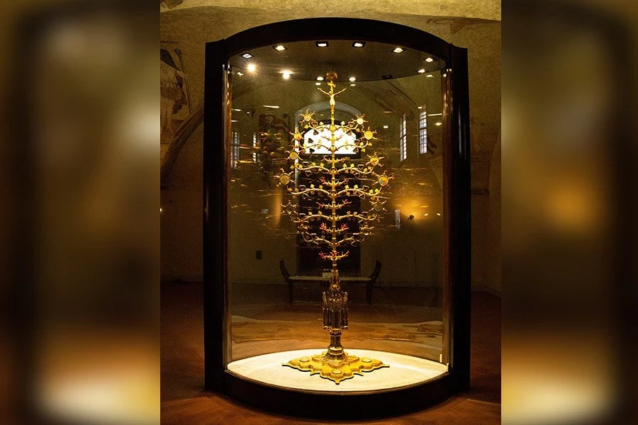 Золотое дерево высотой более 2,5 мета и шириной около одного метра в самом широком месте было изготовлено из позолоченной меди, серебра и эмали, а его ветви украшены кораллами, горным хрусталем и миниатюрной иллюминацией на пергаменте. Он был вдохновлен Lignum Vitae («дерево жизни»), трактатом, написанным святым Бонавентурой в 1260-х годах, чтобы помочь францисканцам посвятить себя Христу, созерцая его жизнь, страсти и прославление. Структура дерева служила мнемоническим средством для монахов, позволяющих им ежедневно размышлять о делах Христа. Подобно Христу, «пригвожденному к дереву», Древо Жизни в конечном итоге принесло плод спасения. Концепция lignum vitae укоренилась во францисканских общинах и среди читателей-непрофессионалов и стала популярным мотивом в средневековом искусстве.