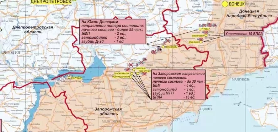 Одним из самых напряженных направлений за минувшие сутки оказалось Донецкое. Вооруженные силы Российской Федерации (ВС РФ) отразили две атаки противника, общие потери украинских войск составили до 220 человек.
