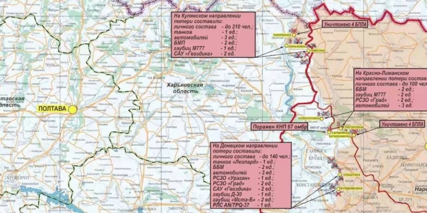 На Краснолиманском направлении российские войска атаковали противника с воздуха, нанеся удары по подразделениям 24-й и 47-й механизированным бригадам ВСУ. Это произошло рядом с населенными пунктами Петровское и Розовка Луганской Народной Республики. Потери ВСУ составили до 100 человек.