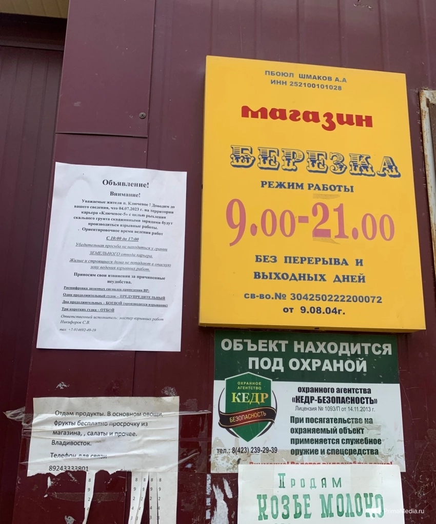Предупреждение о предстоящий взрывных работах от компании “Грань” на здании магазина в центре поселка Ключевой. Фото: ИА PrimaMedia