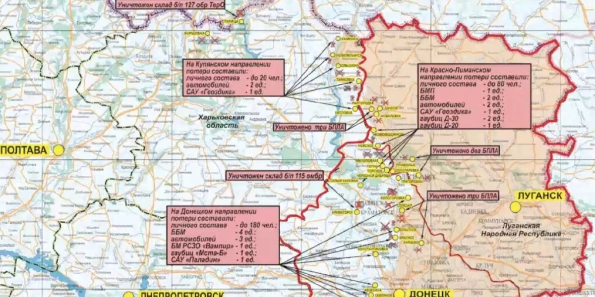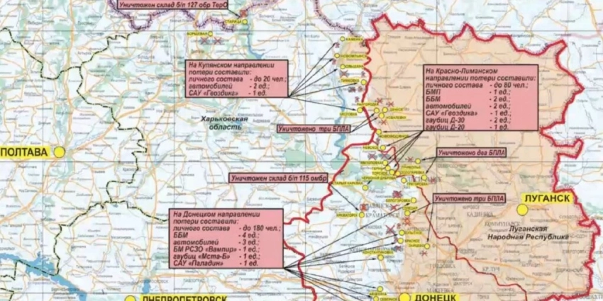 Общие потери противника на данных направлениях составили свыше 210-ти украинских военнослужащих и иностранных наемников, четыре танка, три боевые машины пехоты, две боевые бронированные машины, два пикапа, боевая машина РСЗО «Град», самоходная гаубица «Гвоздика», две гаубицы Д-20 и одна «Мста-Б», а также самоходная артиллерийская установка М109 «Paladin» производства США.
