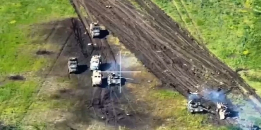 Кадры были сделаны с помощью беспилотника, который заснял передвижение колонны украинской военной техники. Через некоторое время танки и бронемашины начали подрываться на минах. Также можно заметить другую технику, находящуюся в поврежденном состоянии. Вероятно, она также подорвалась на одной из мин.