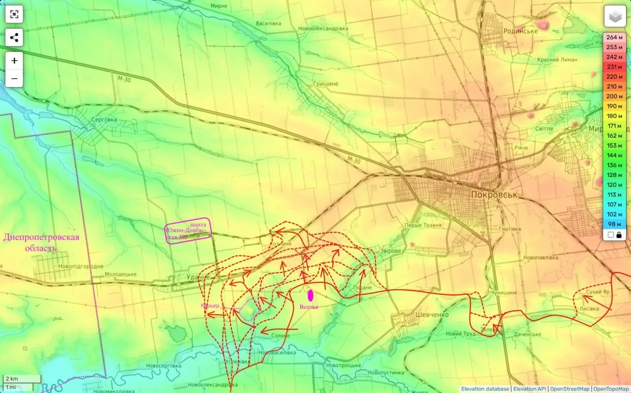 Таким образом фронт противника продолжает уверенно трещать и поддаваться назад, приближая нас сразу к двум целям - глубокому охвату Покровской агломерации с запада и … выходу к Днепропетровской области. До которой из занятой нами части Удачного осталось всего 5 км. А с западной окраины его будет и вовсе чуть больше 2 км.