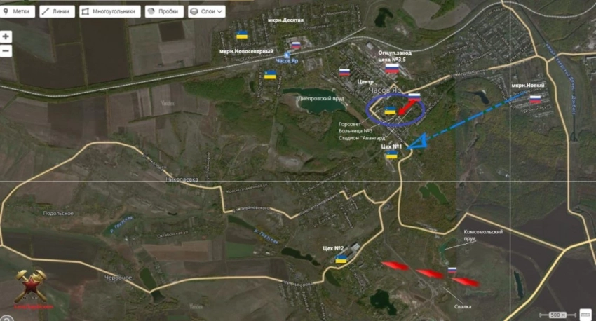 В Часов Яре продолжаются ожесточённые бои. Наши бойцы штурмуют позиции ВСУ в микрорайоне Новосеверный и чуть юго-восточнее - близ рынка.