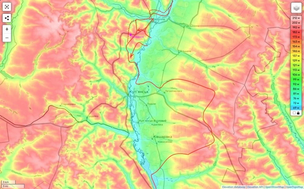 О нем, как об одной из приоритетных наших здесь целей я говорил уже давно. Как только на правом берегу Оскола сфоримровался относительно устойчивый плацдарм. Именно контроль н.п. Западное и высот рядом позволяют нам прикрыть переправы (а для стратегического наступления их здесь надо делать несколько) от прицельного огня ПТУРов и «стрелкотни». Заставляя привлекать к этому артиллерию и «Химари». А это опасно уже для них и рано или поздно приводит к подавлению пусковых установок и батарей.