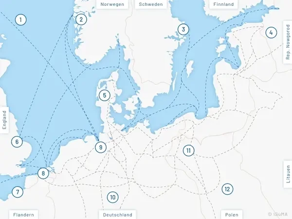 Карта с изображением основных путей Ганзейского союза. Ганзейский союз был позднесредневековой сетью экономически независимых купцов на дальние расстояния, которая была основана на доверии, репутации и взаимных отношениях. Сотрудничество между ее членами поддерживало транзакционные, информационные и организационные издержки на низком уровне, позволяя ганзейским купцам получать хорошую прибыль от торговли на дальние расстояния между Балтийским и Северным морями. Благодаря личным и институциональным связям с конфедерациями городов ганзейские купцы изначально смогли укрепить свое международное положение власти.