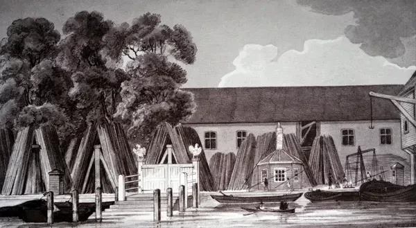 Репродукция акварельного рисунка «Штальхоф» (Steelyard), подворья Ганзейского союза в Лондоне, — сувенир Британской выставки в Зале Наций IPA в Лейпциге. На иллюстрации изображена часть речного фрегата и водные ворота, увенчанные с каждой стороны эмблемой Союза — германским орлом. Сейчас на этом месте находится железнодорожная станция Cannon Street. 1930 год. Источник: Kollektion Kuhn.