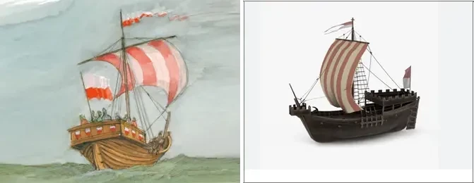 На фото слева: «Рисунки Ганзы». Художник: H. J. Draeger / Boyens Buchverlag GmbH & Co. На фото справа: 3D-модель средневекового когга
