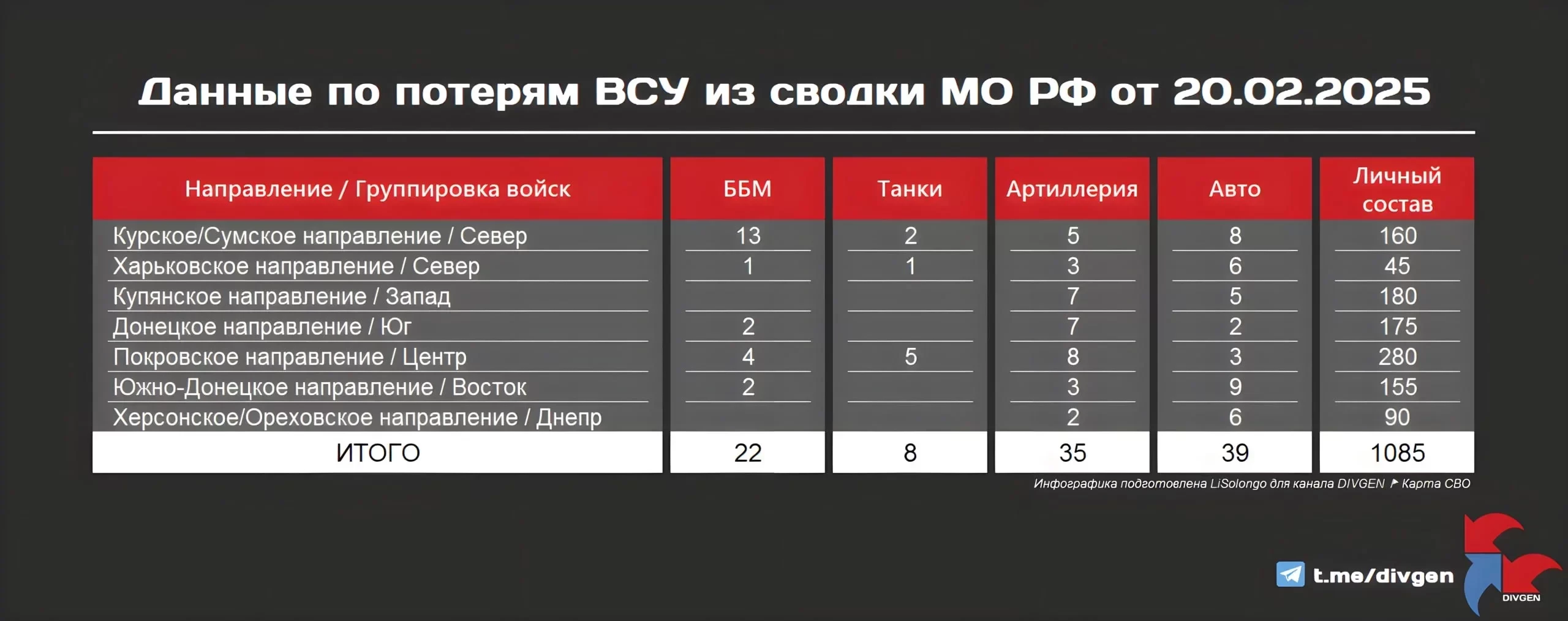 Согласно данным, представленным в сводке Министерства обороны Российской Федерации на вечер 20 февраля 2025 года, потери противника за минувшие сутки составили следующее: